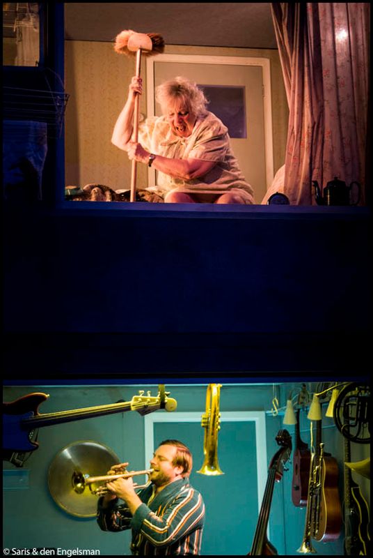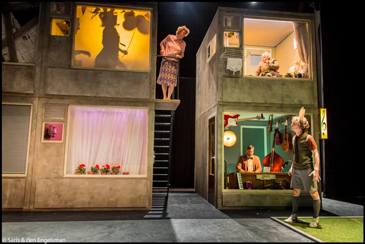 Music from downstairs is a visual performance full of live music, made for everyone with neighbours. A performance about a street full of closed doors, overflowing hearts and music that penetrates through all the walls.